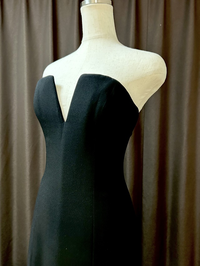 シンプルエレガントの代表的なデザインのVERA WANG Jocelyn。その中でも拝見する機会が非常に少ない限定レアカラーバージョンです。バックトレーンのモチーフに一部細かい破れがありますが外観からは判別出来ない状態に修正済です。そこを差し引いても手に入れる価値は十分にある滅多に登場する事のないレアドレスです。深さと優しさを兼ね備えた黒の染色技術は、既製品や低価格ネットオーダーのドレスでは簡単に出す事の出来ない高級感が溢れています。