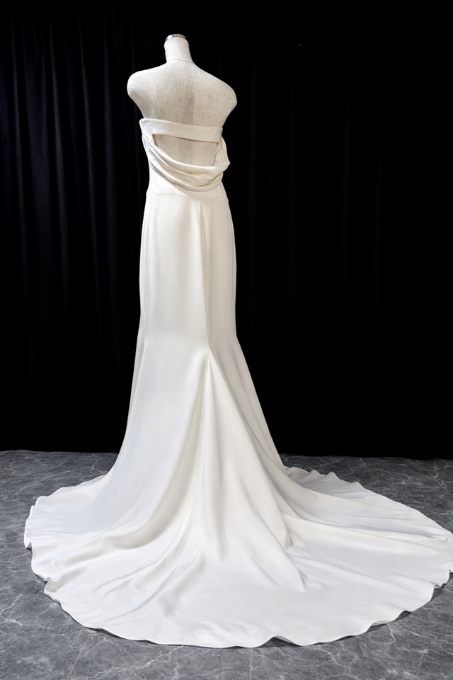 上品な艶感のあシルククレープ生地をベースに美しく覆いながら背中を綺麗に魅せるアクセントを付けたバックスタイルが特徴的なオデール。オーナー様のご厚意で価格設定も低めに設定して頂いております。シルク素材は使用によるシミや黄変が出やすい傾向がありますがこちらのオデールは当社のプレミアムドレスクリーニングにより全体の仕上がりも抜群なコンディションです。