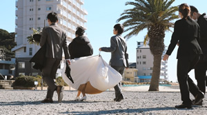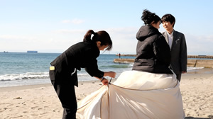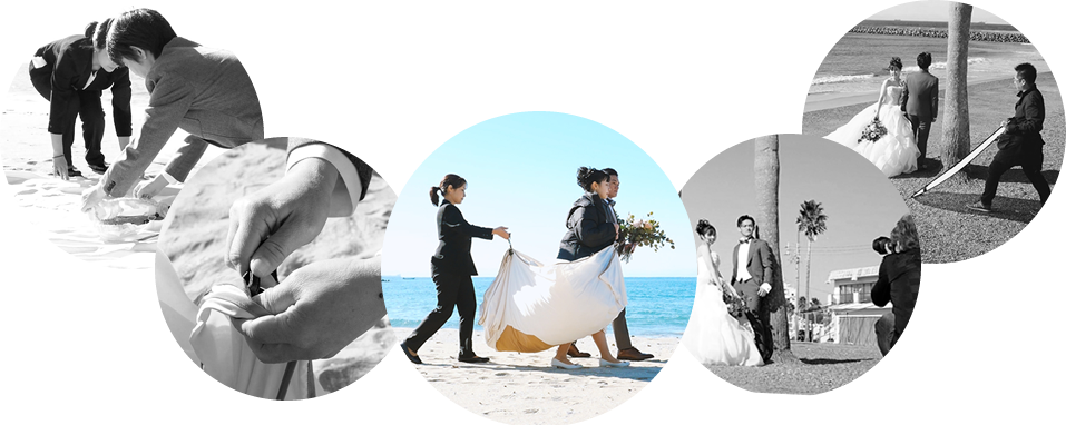 撮影の移動時など、ドレスのトレーン部分(裾)は付添の人が両手で抱えるように持ち上げている場面をよく見ますが、ドレスのデザインや形状によって、どうしても地面に擦ってしまうことがあるようです。