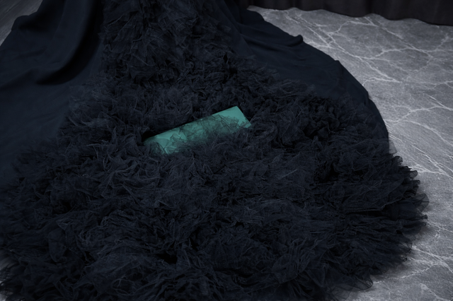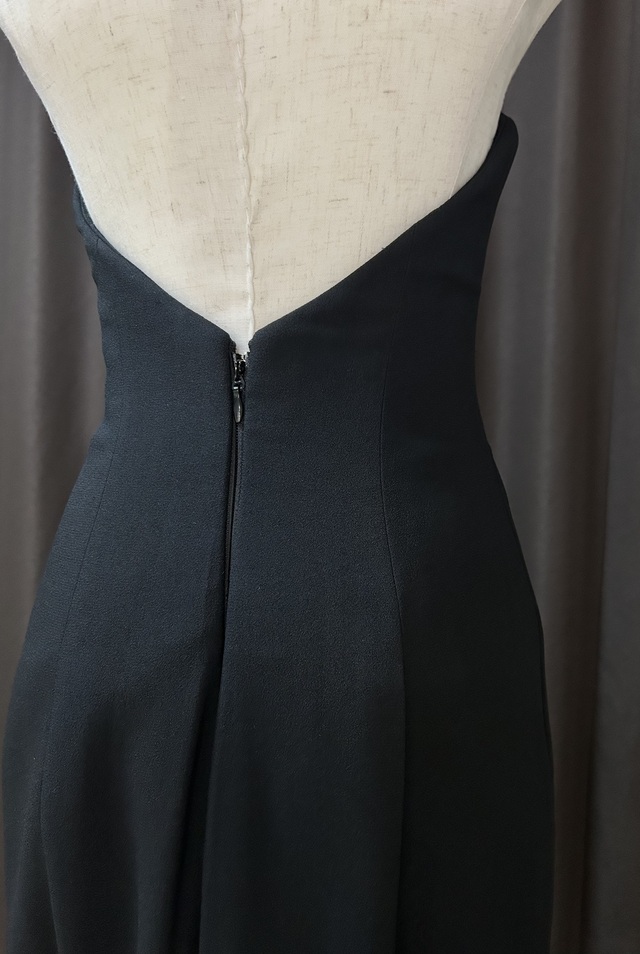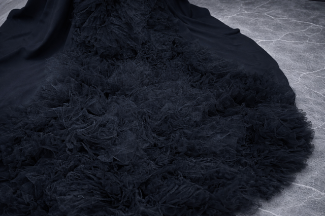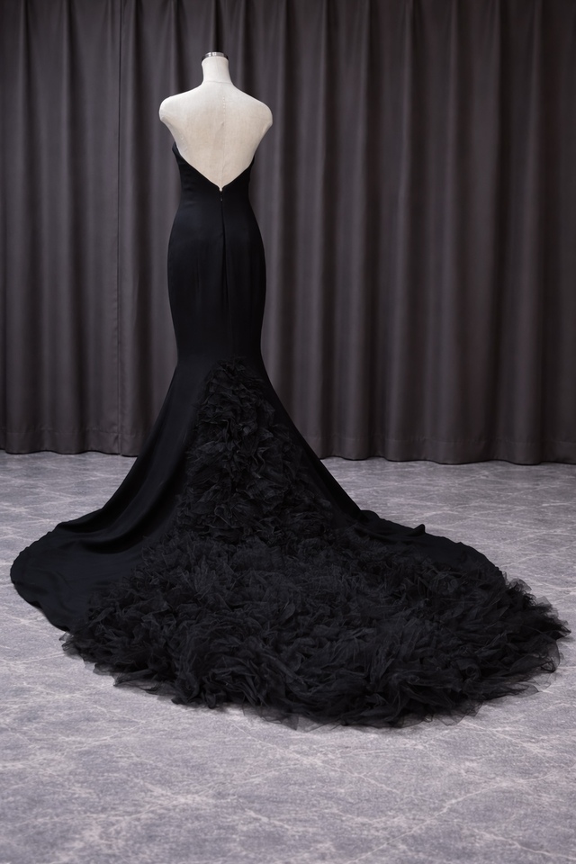 シンプルエレガントの代表的なデザインのVERA WANG Jocelyn。その中でも拝見する機会が非常に少ない限定レアカラーバージョンです。バックトレーンのモチーフに一部細かい破れがありますが外観からは判別出来ない状態に修正済です。そこを差し引いても手に入れる価値は十分にある滅多に登場する事のないレアドレスです。深さと優しさを兼ね備えた黒の染色技術は、既製品や低価格ネットオーダーのドレスでは簡単に出す事の出来ない高級感が溢れています。