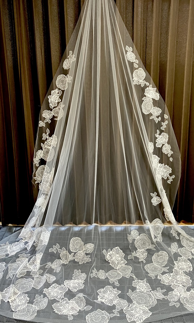 ヴェラウォンのベールシリーズにはドレスネームを冠したものもあります。こちらのベールは「オクタヴィアベール」。繊細なフラワーレースを施したそのデザインはオクタヴィアにはもちろん、他のドレスにも合わせる事が出来る差のつくワンアイテムなレアベールです。