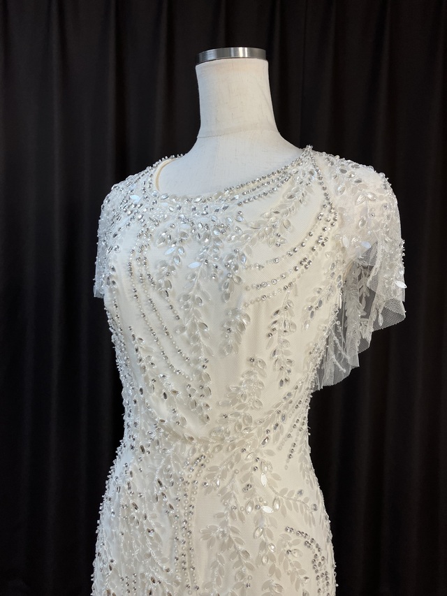 リーフスパンコールとスワロフスキーがボタニーなアイキャッチを装飾され、バックスタイルに美しいアクセントを加えているベルスリーブが印象的なジェニーパッカムのドレスの中でもシックなエレガントさが際立った一着で人気の高いドレスです。それぞれのオーナー様の丁寧なお取り扱いが伝わるコンディション良好なレアドレスです。