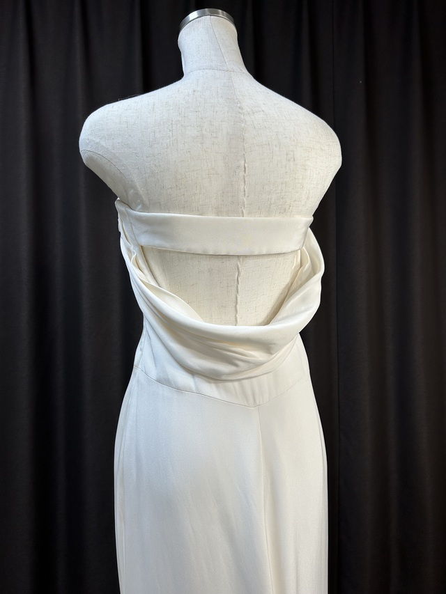 上品な艶感のあシルククレープ生地をベースに美しく覆いながら背中を綺麗に魅せるアクセントを付けたバックスタイルが特徴的なオデール。オーナー様のご厚意で価格設定も低めに設定して頂いております。シルク素材は使用によるシミや黄変が出やすい傾向がありますがこちらのオデールは当社のプレミアムドレスクリーニングにより全体の仕上がりも抜群なコンディションです。